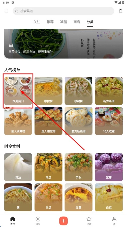 2、在分类页面点击【本周热门-分类标签】,进入本周热门菜谱列表。