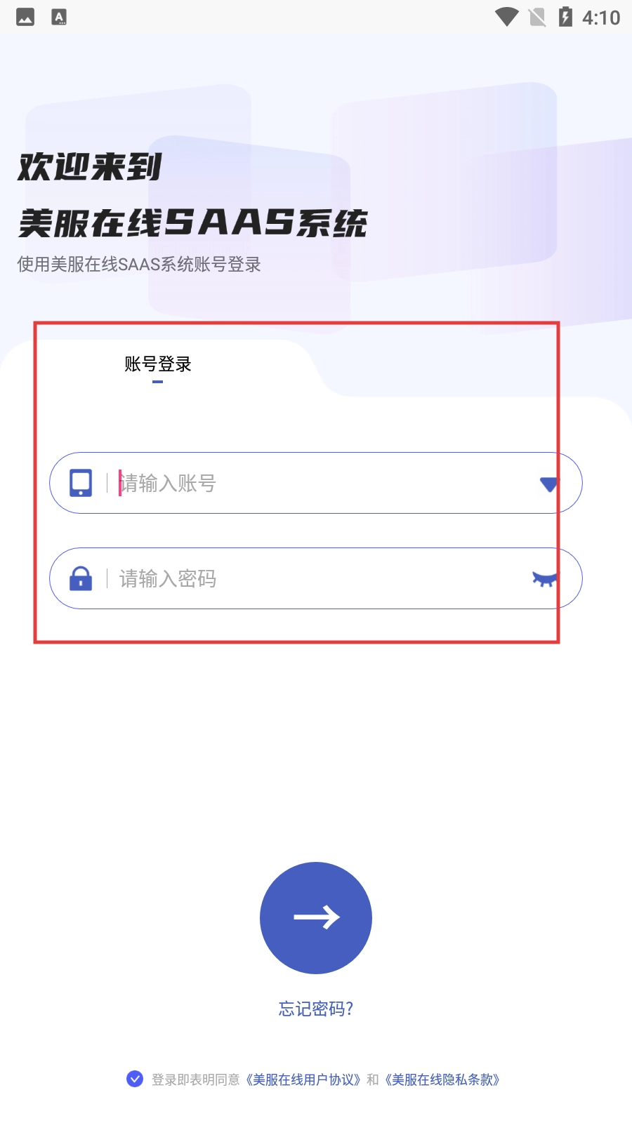 3、在登录界面,输入账号和密码,点击下方箭头按钮完成登录操作。