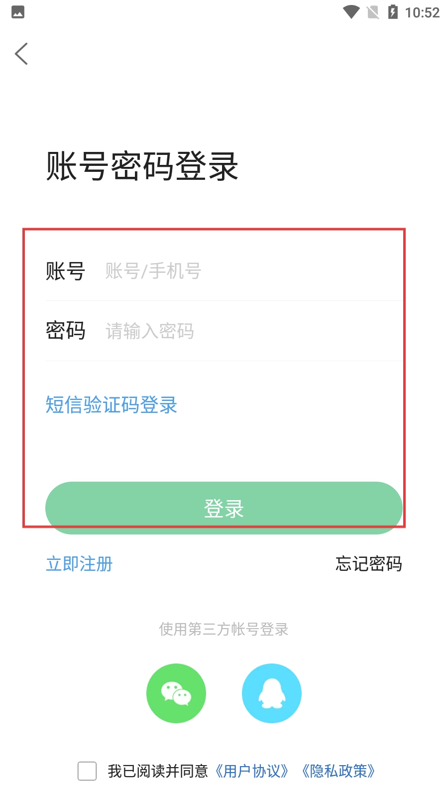 4、在账号密码登录页面,输入【账号/手机号】和【密码】,完成账号登录。