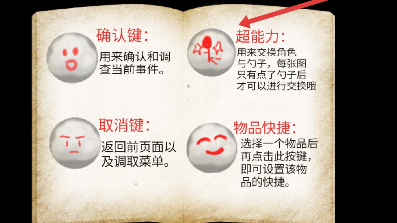 1、浏览教程界面,记清确认键、超能力、取消键和物品快捷的作用,熟悉基础操作逻辑。