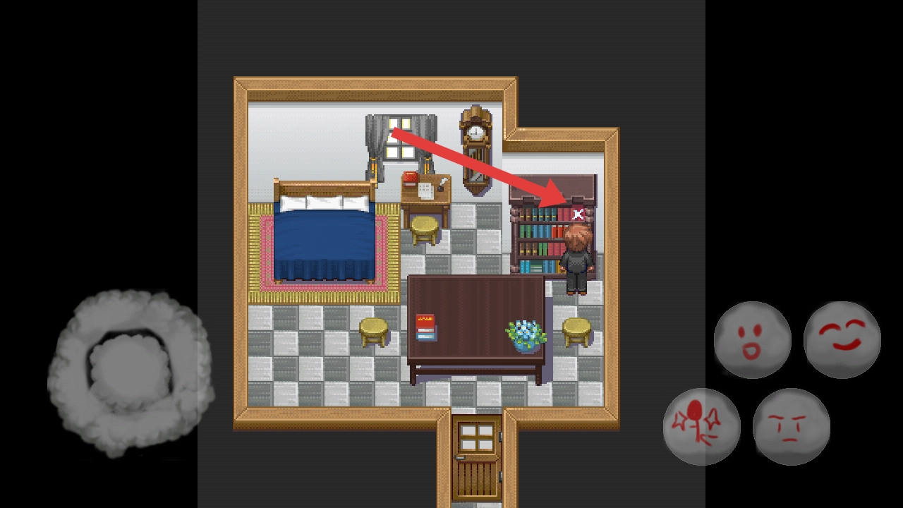2、需要操控角色移动至房间书架发光点旁,点击右侧确认键笑脸图标,触发互动进行调查。