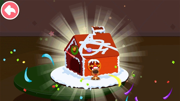 4、点什么?点击糖果盒,把糖球、拐杖糖和小熊软糖放上去吧。哇,好可爱的姜饼屋!
