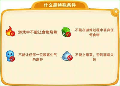 特殊条件是指关卡的限制条件。如不能烧焦、不能上错菜等,在进入关卡时会有特别说明(如图)。一旦不小心触发,就会判定挑战失败,大厨需要特别注意限制条件哦。