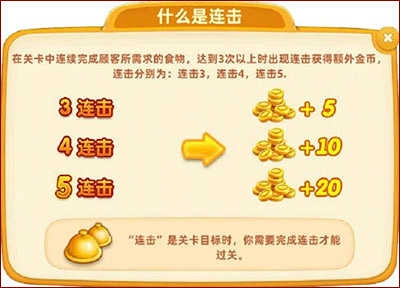 连击要求大厨在关卡中连续完成顾客所需求的食物,连续上菜达到3次以上时出现连击并可获得额外金币(两次及以下不计算连击)。最高连击为5连击,可额外增加20金币。