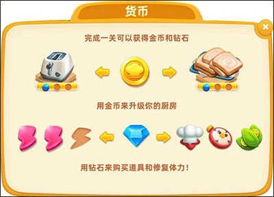 1、金币:完成关卡可以获得本关产出的金币(双倍加成道具、连击均可以提高金币的产出);金币用于升级设备和食材。