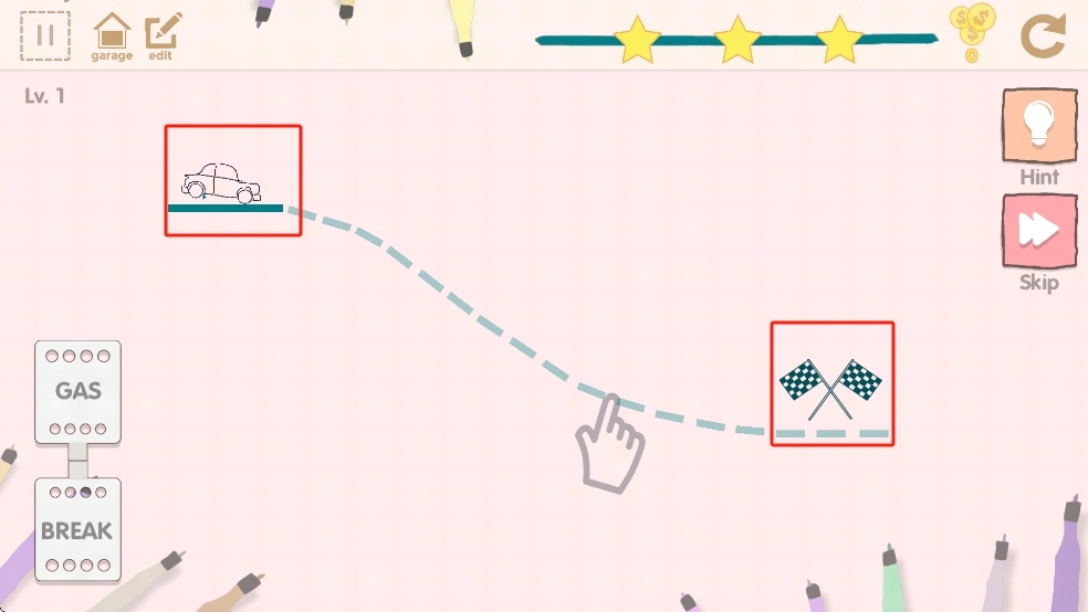 2、点击左侧GAS按钮启动绘制好的汽车,沿虚线轨迹行驶,适时操作BREAK按钮减速,平稳驶向终点方格旗区域。