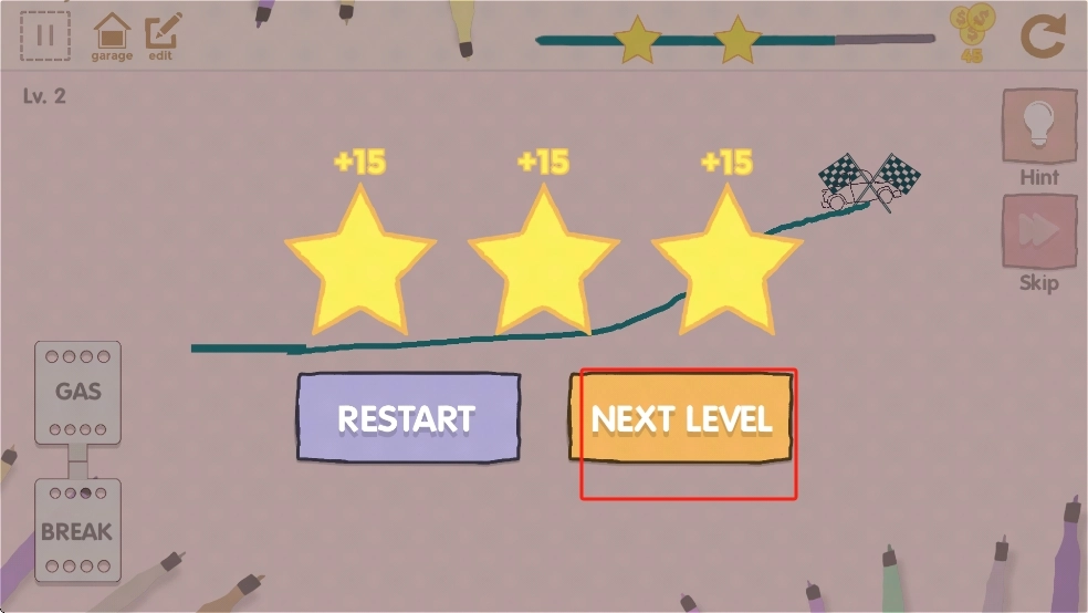 3、车辆顺利跑完路线后即可通关,点击橙色的NEXT LEVEL按钮,开启更复杂的赛道绘图挑战。