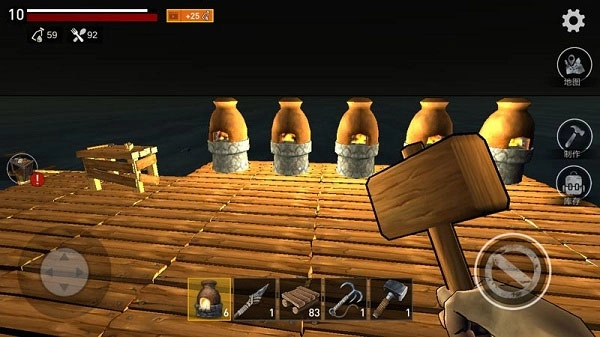 一开始用钩子勾多一点东西,然后可以弄锤子。锤子可以帮助拓宽竹筏。鲨鱼也会来要竹筏,可以用叉叉吓走他。
