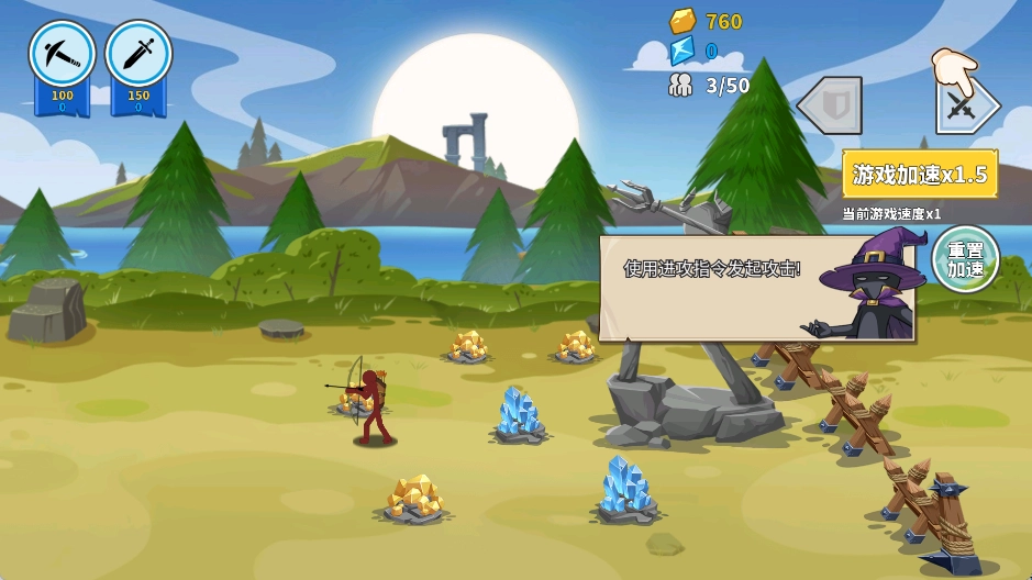 2、兵种招募:消耗黄金在基地招募剑士、弓箭手、矛士等多种火柴人士兵,各兵种能力不同。