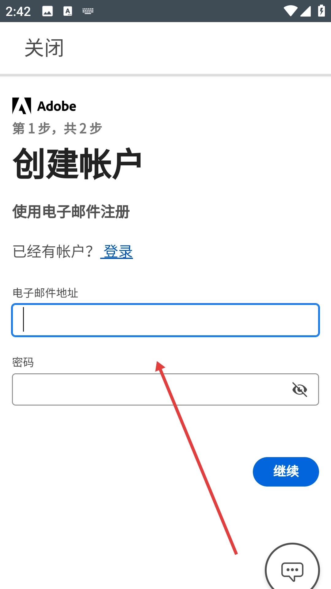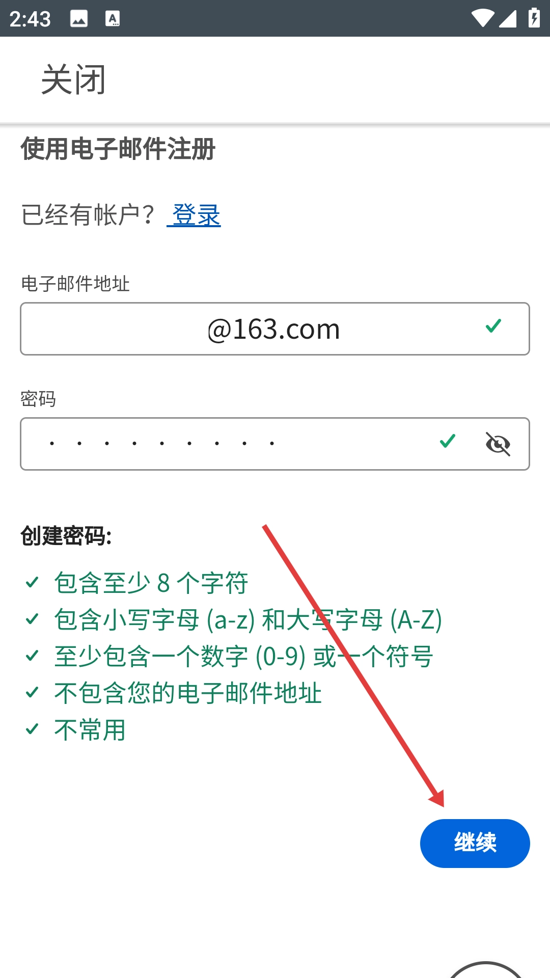 3、在创建帐户页面填写电子邮件地址和密码,密码需满足包含至少8个字符、大小写字母、数字或符号等要求。