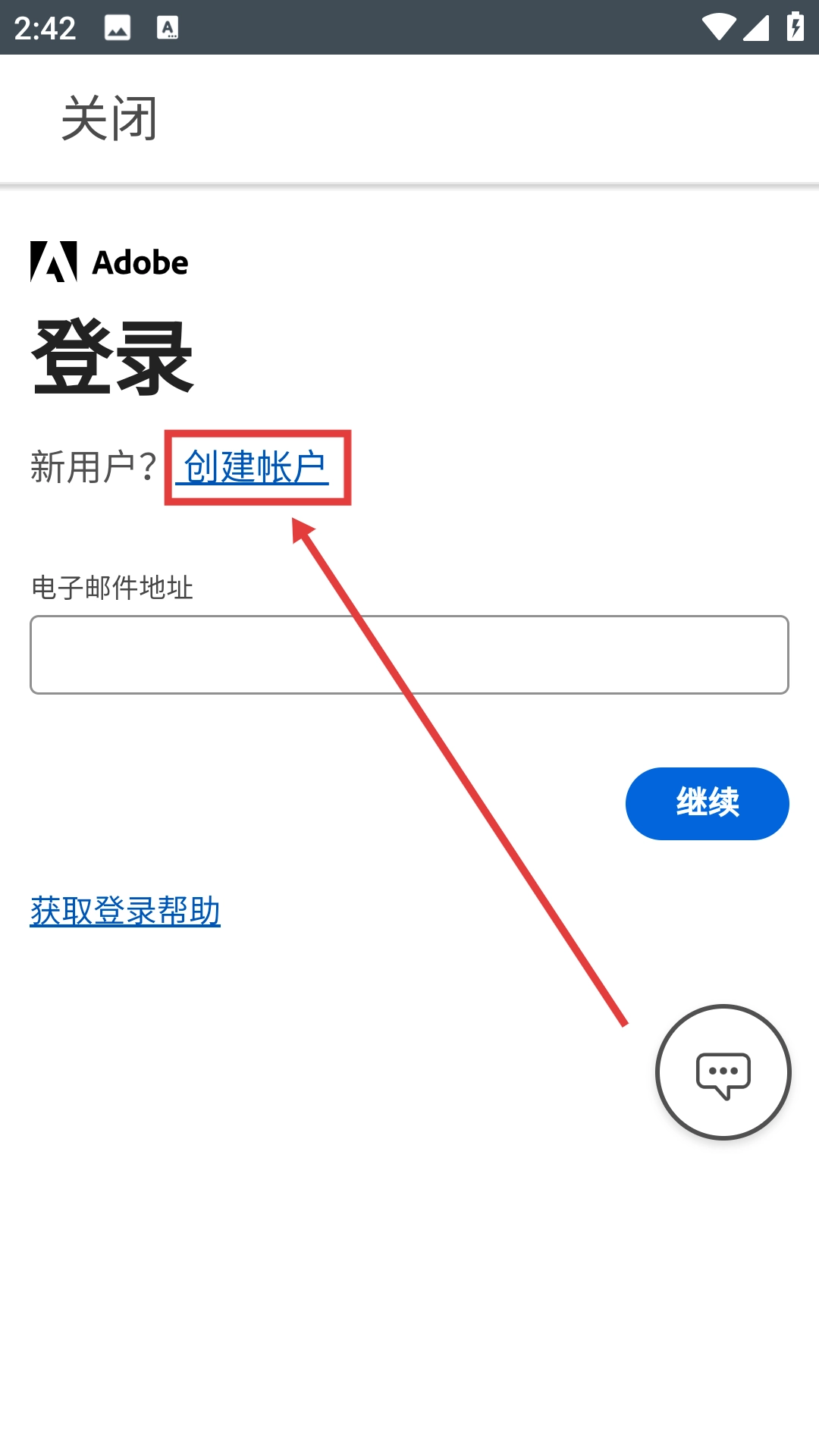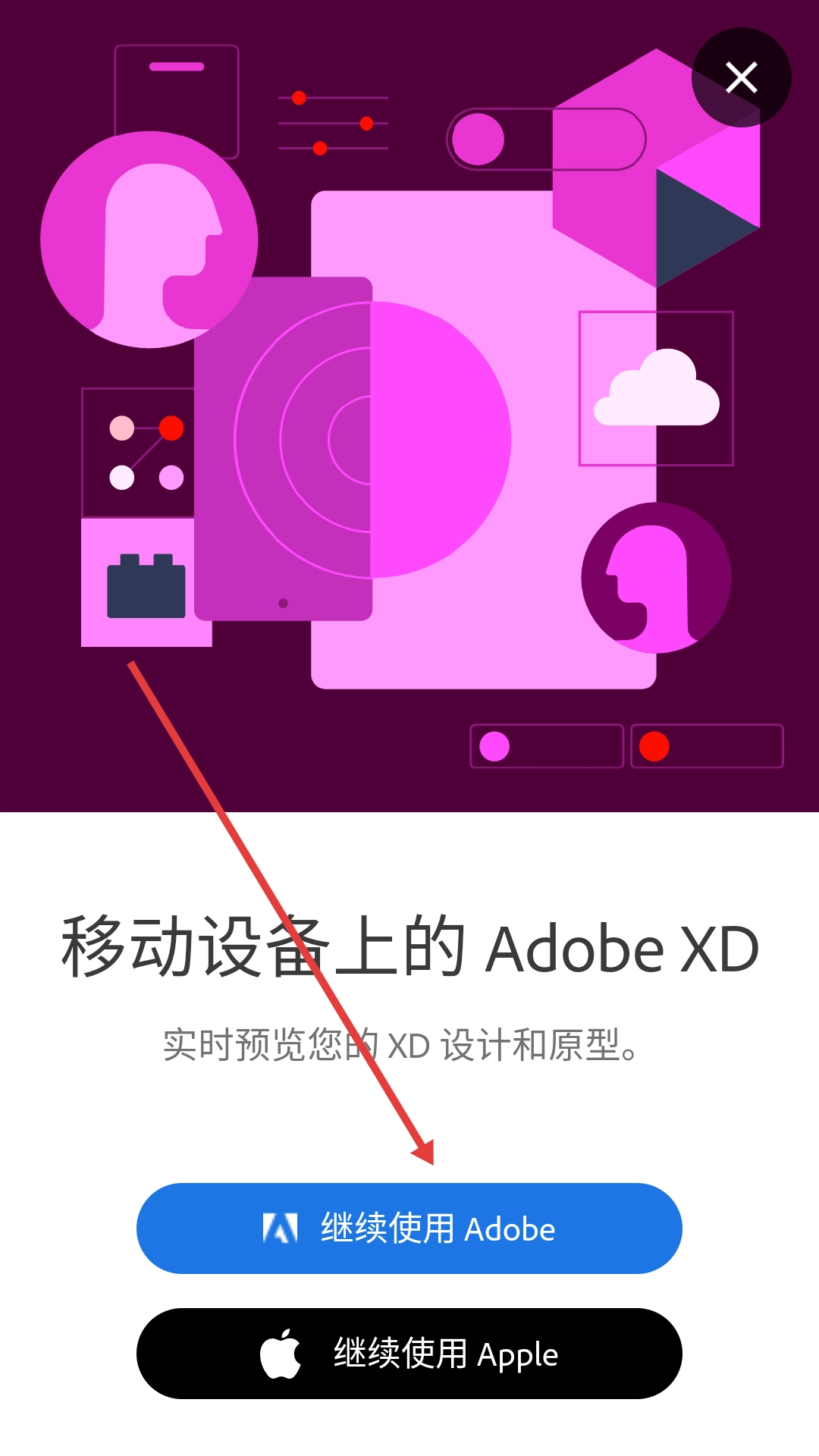 1、点击【继续使用Adobe】按钮,即可进入Adobe的登录页面。