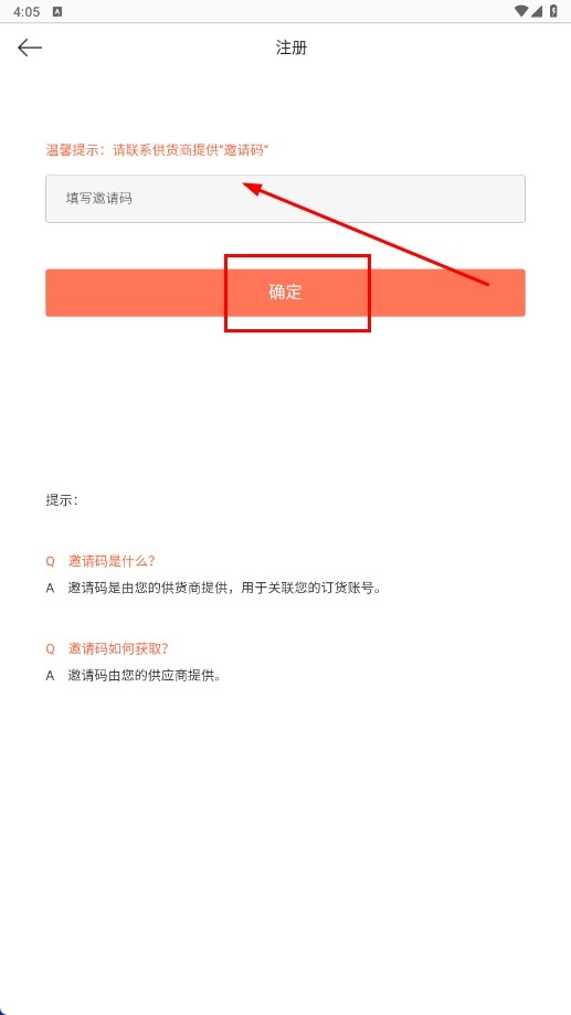 3、进入注册页面,填写邀请码后点击【确定-功能按钮】,继续注册流程。