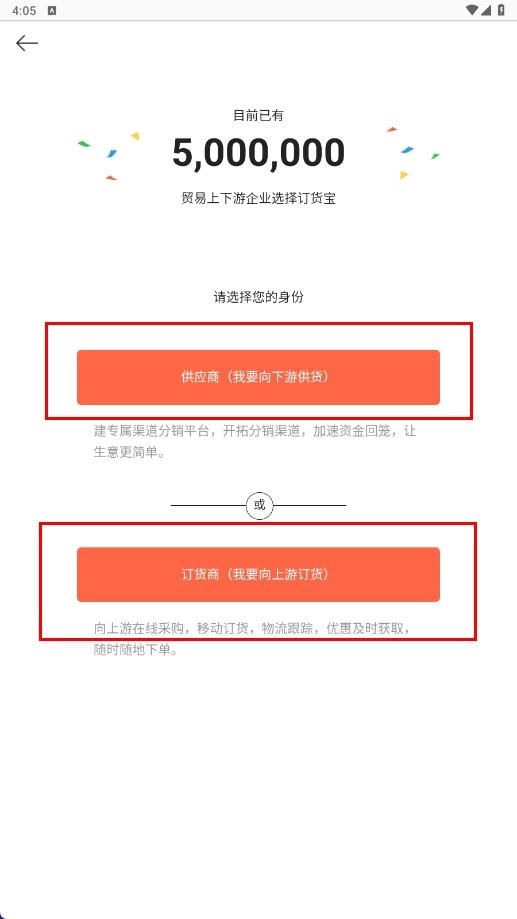 2、在身份选择页面,可选择【供应商(我要向下游供货)】或【订货商(我要向上游订货)】身份。