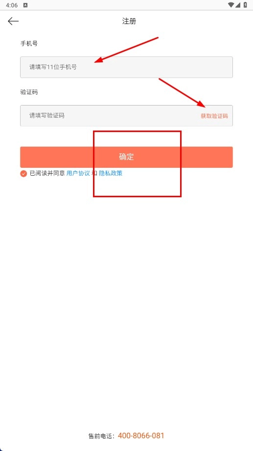 4、在注册页面填写手机号,点击【获取验证码】,输入验证码后点击【确定-功能按钮】完成注册。