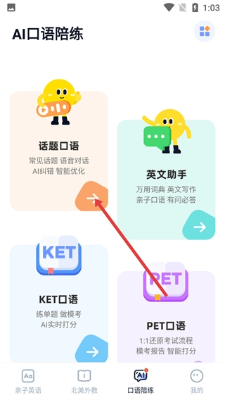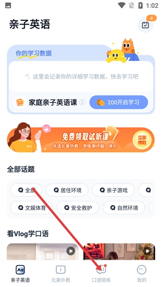 1、打开亲子英语首页,点击页面底部的【口语陪练】选项,即可进入AI口语陪练页面。