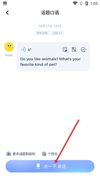 3、在话题口语界面,点击底部【点一下说话】,开始录制口语回答。