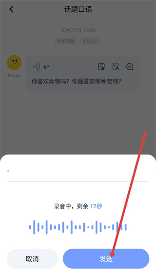 4、录音完成后,点击【发送】,提交口语练习内容,完成一次话题口语练习。