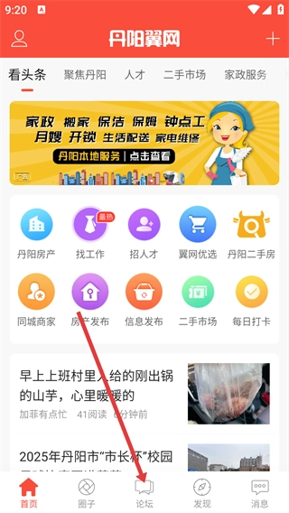 1、打开【丹阳翼网】首页后,点击页面底部的【论坛】按钮,就能进入论坛板块浏览各类话题内容。