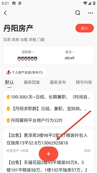 3、在【丹阳房产】页面,点击红色【+】按钮,可发布房产买卖、租赁等信息。