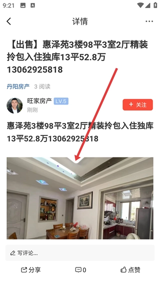 4、点击房产信息条目,进入详情页可查看房屋图片、价格、联系方式等详细内容。