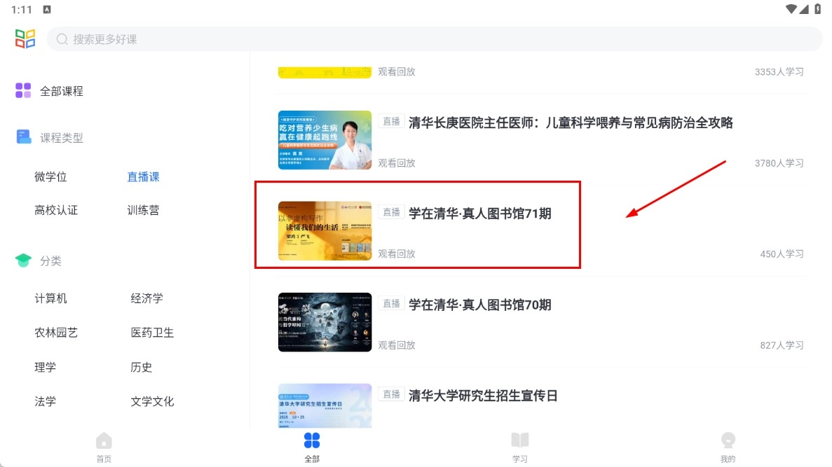 3、在直播课列表找到例如【学在清华-真人图书馆71期-课程卡片】并点击,进入课程详情页。