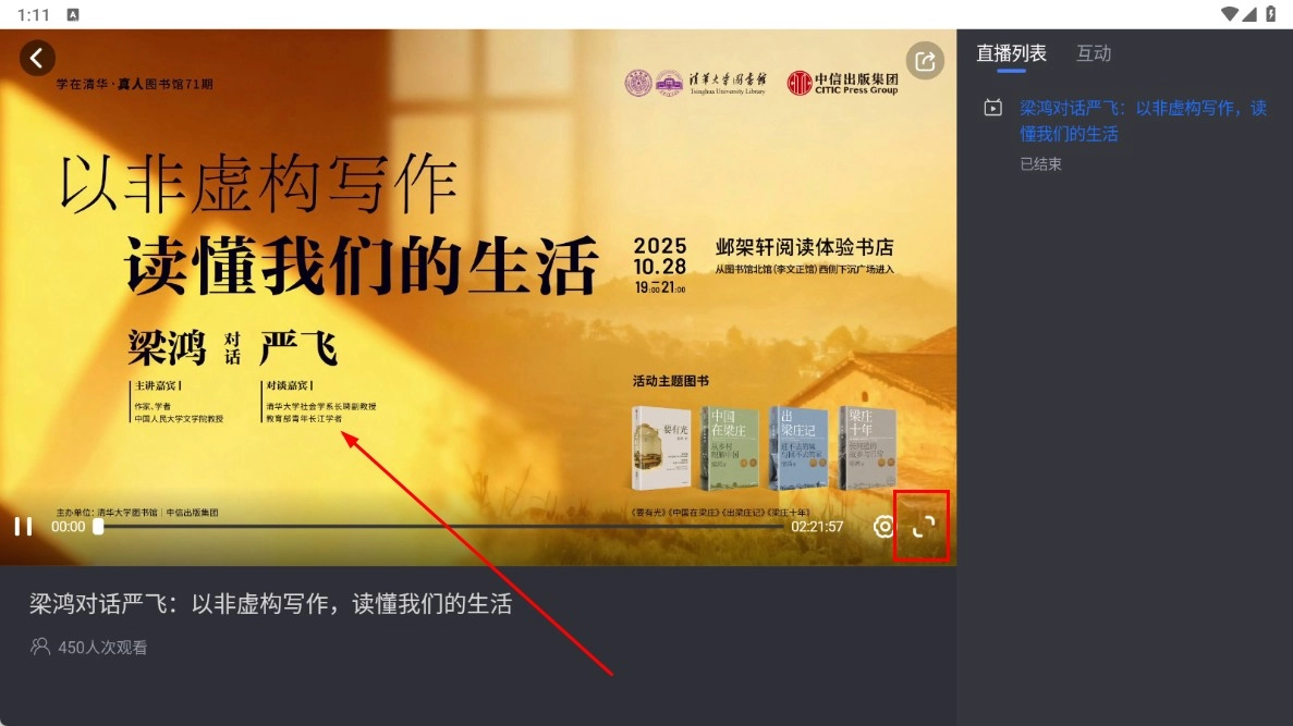 4、进入课程详情页后,可观看直播课程,还可点击全屏图标进行全屏观看。
