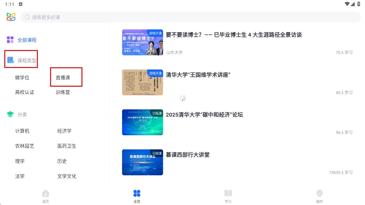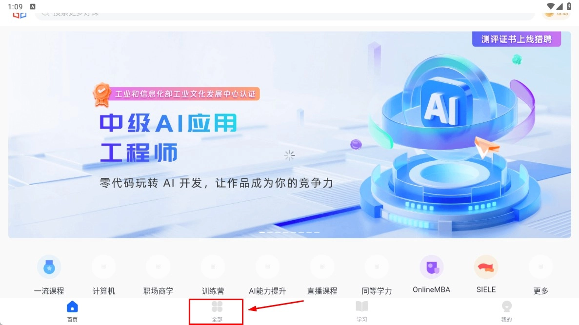 1、点击底部的【全部-功能按钮】,即可进入全部课程页面。