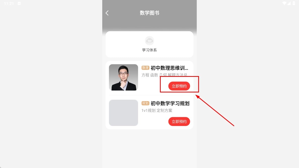 3、在数学图书页面,点击【立即预约-功能按钮】,预约初中数理思维训练相关内容。