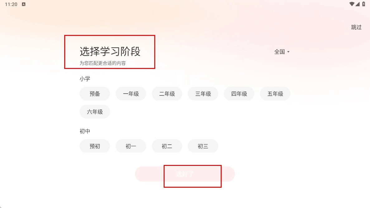 1、在【选择学习阶段】功能模块中,选定对应的学段年级后,点击【选好了】功能按钮。
