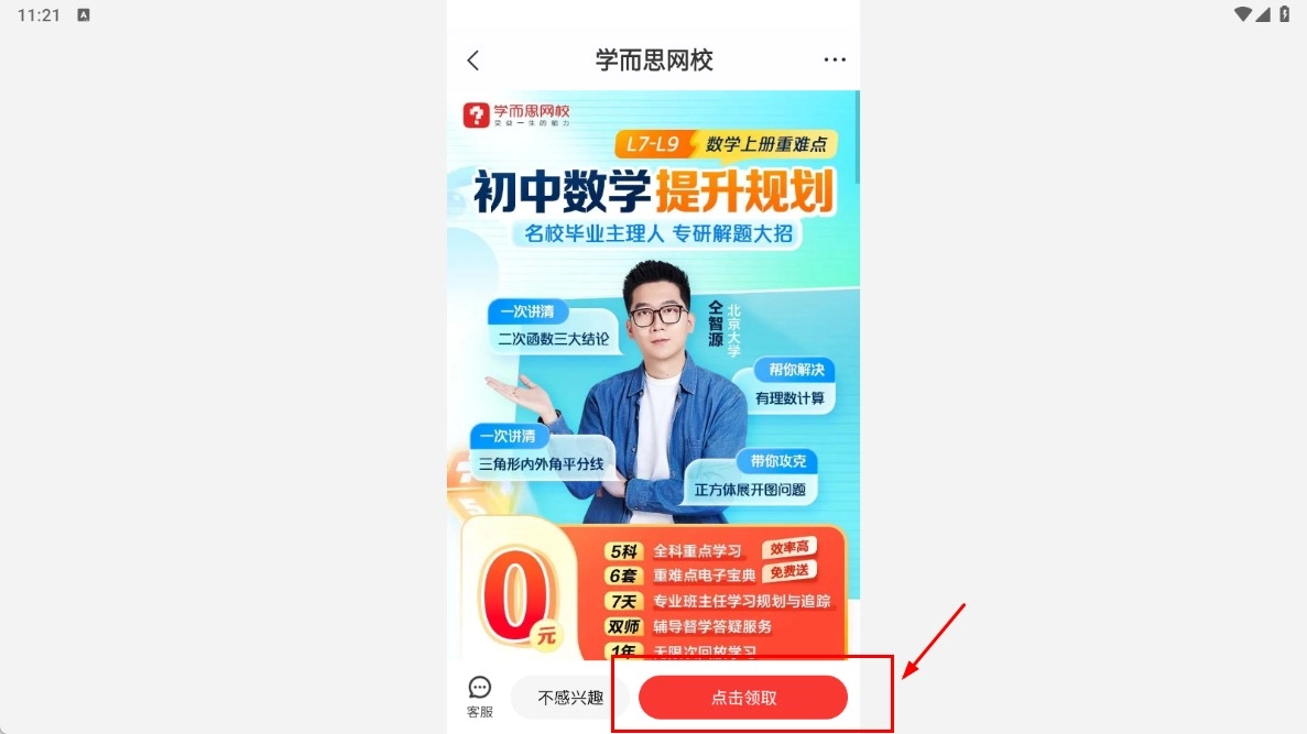 4、在弹出的学而思网校初中数学提升规划页面,点击【点击领取-功能按钮】,领取相关学习资源。