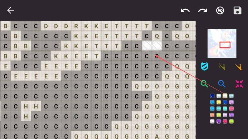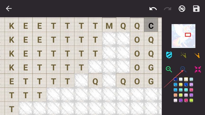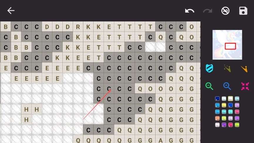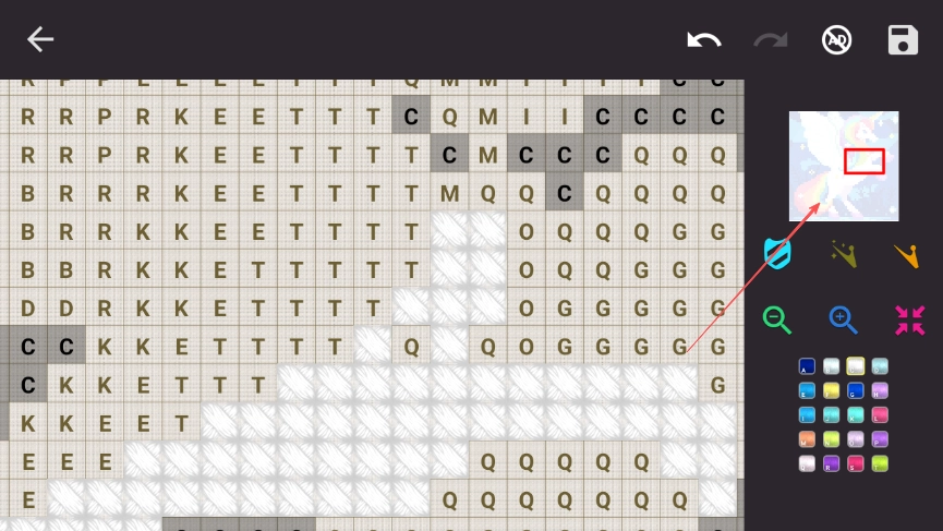2、点击方格填色,将找到的对应字母方格填充,逐渐拼出目标图案轮廓。