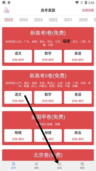 1、点击底部的【诗词】选项进入诗词板块后,可选择诗词或文言文类别,获取高考语文诗词与文言文的复习资源。