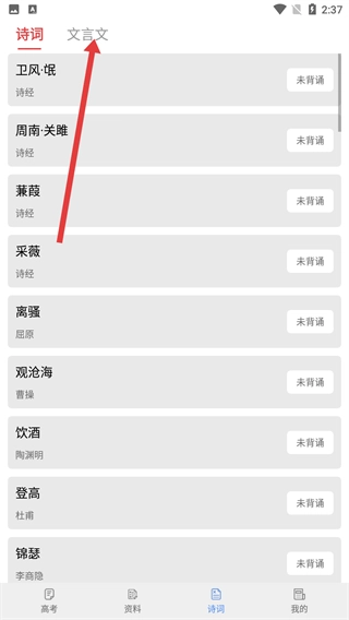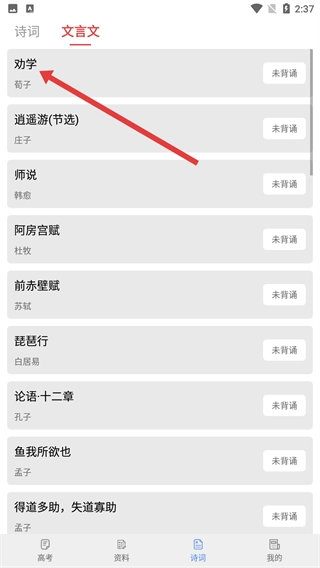 2、在诗词板块点击【文言文】标签,切换到文言文列表,可查看《劝学》《逍遥游》等高考必背文言文篇目。