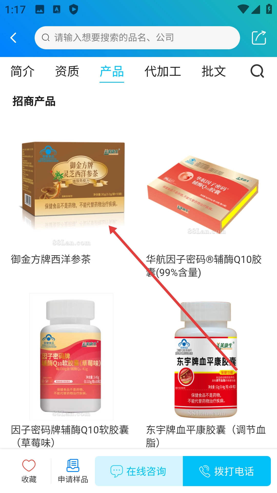 1、点击底部的【产品】选项,进入产品列表页面后,就能查看各类保健品公司以及相关产品的信息。