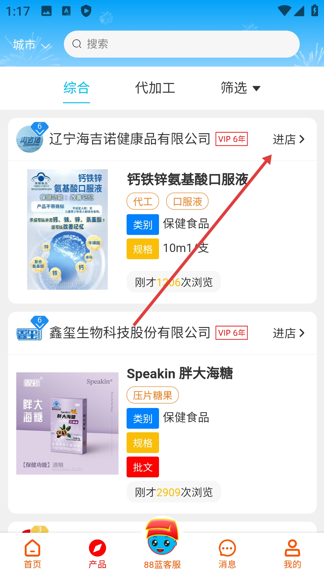 2、在产品列表页面点击公司旁【进店】,进入公司的产品展示页面。