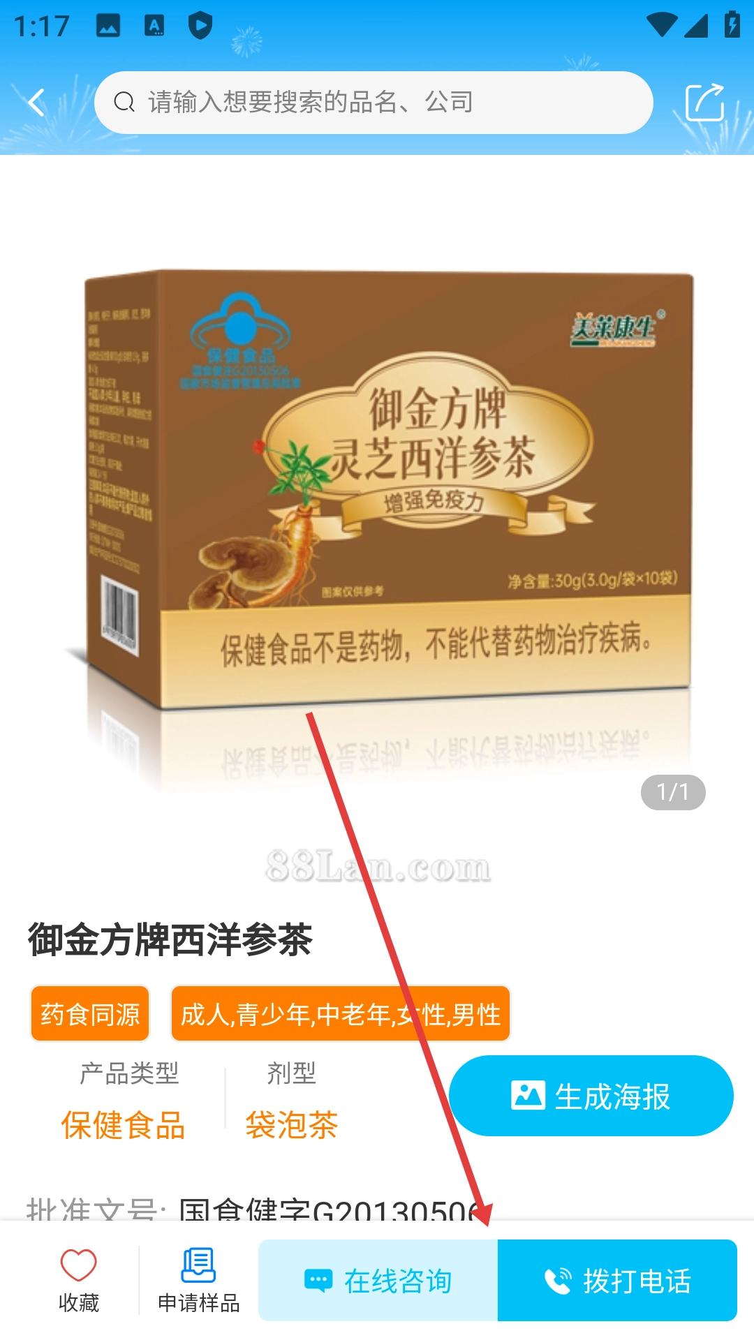 3、在公司产品展示页面点击具体产品(如御金方牌西洋参茶),进入产品详情页面。