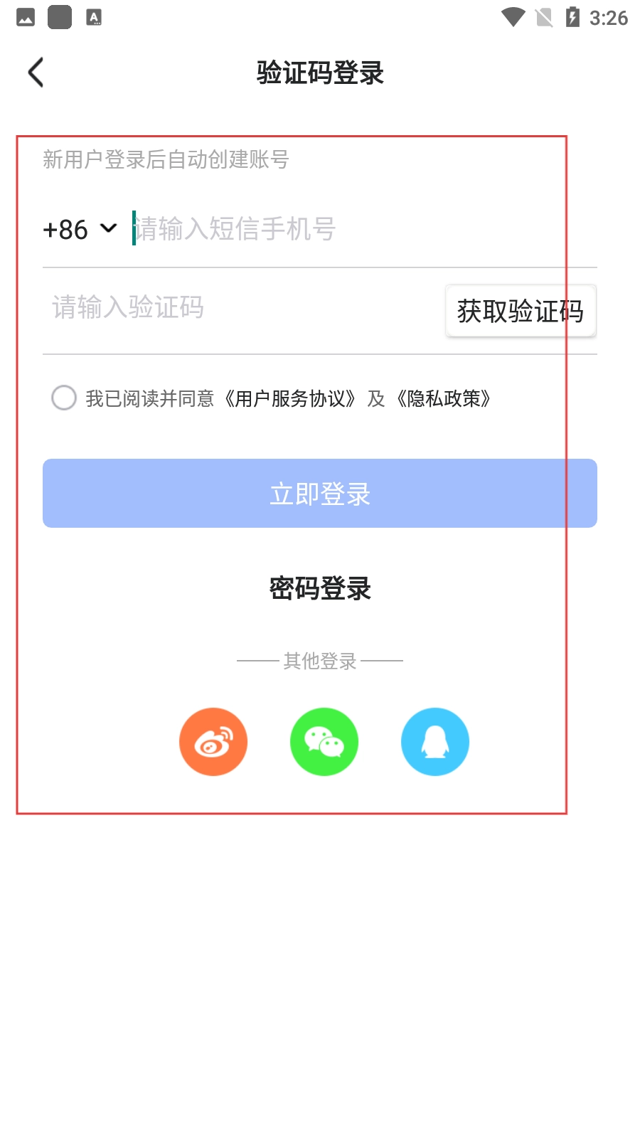 3、在登录页面,可选择验证码登录、密码登录或微博、微信、QQ等第三方账号登录,若选择验证码登录,进入相应流程。