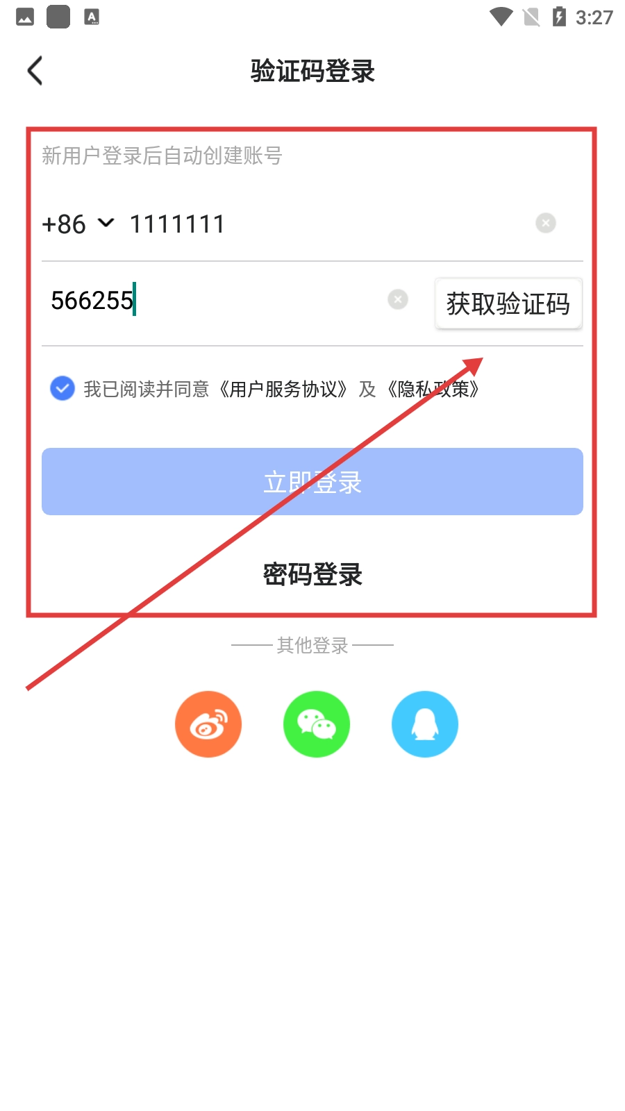 4、在验证码登录页面,输入手机号,勾选同意,点击【获取验证码】,输入收到的验证码后点击【立即登录】即可完成登录。