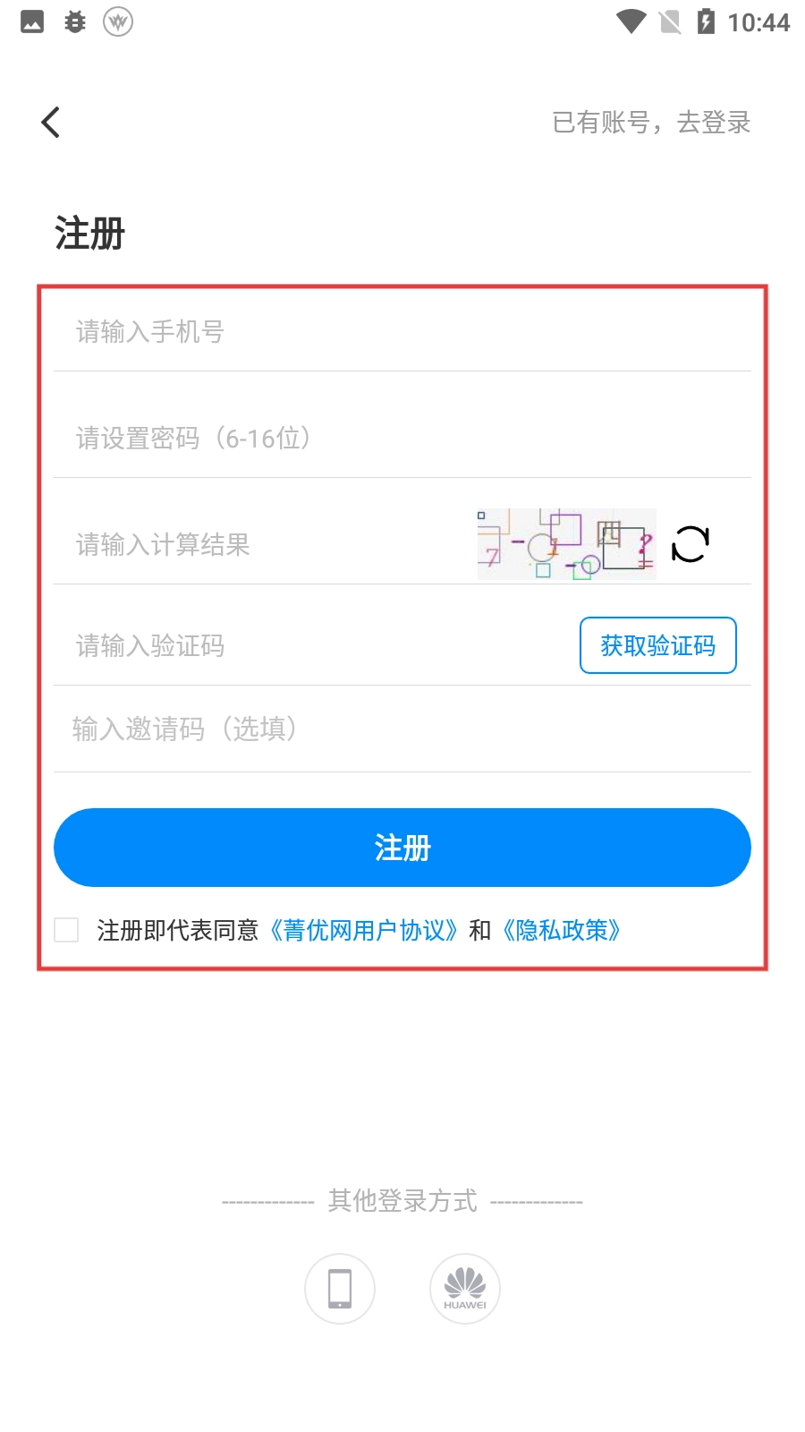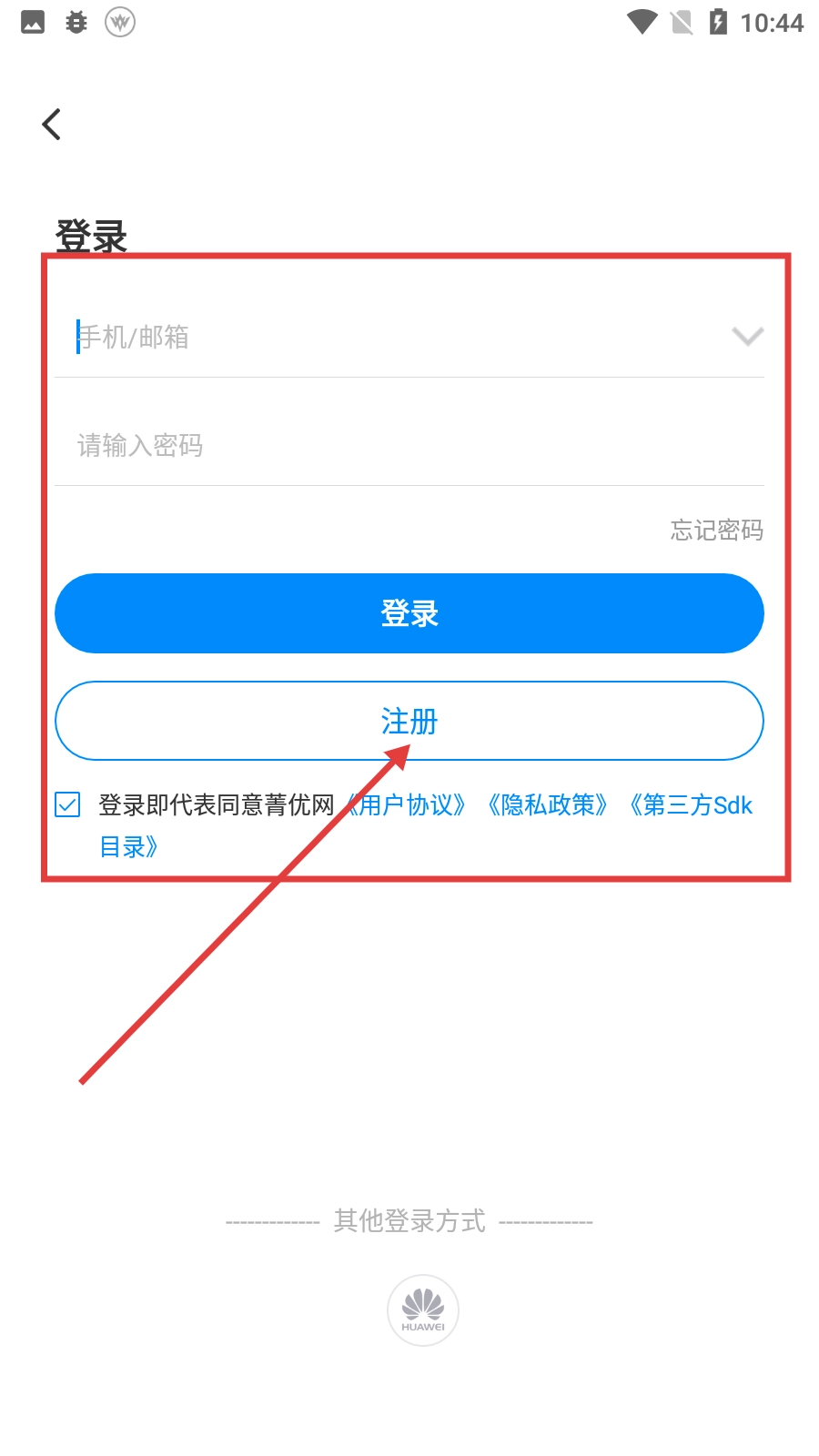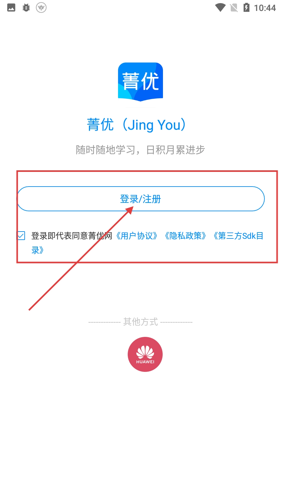 使用菁优平台时,点击【登录/注册】按钮进入登录注册页面,需先勾选同意相关协议,之后才能开展后续操作。