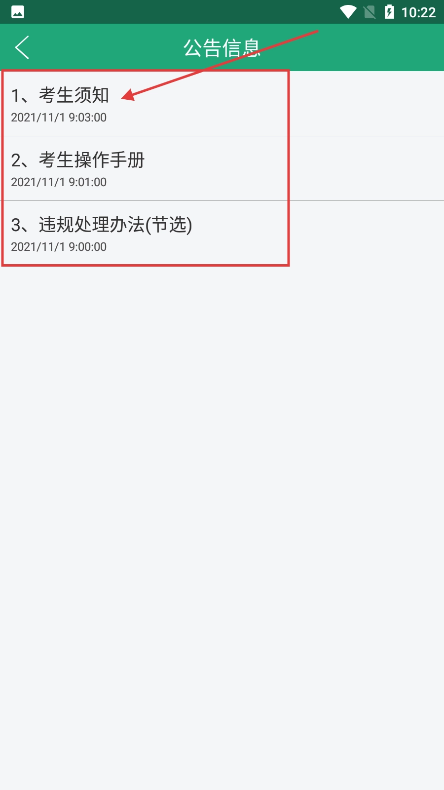 2、在公告信息列表中,点击【考生须知】,进入公告详情页面。
