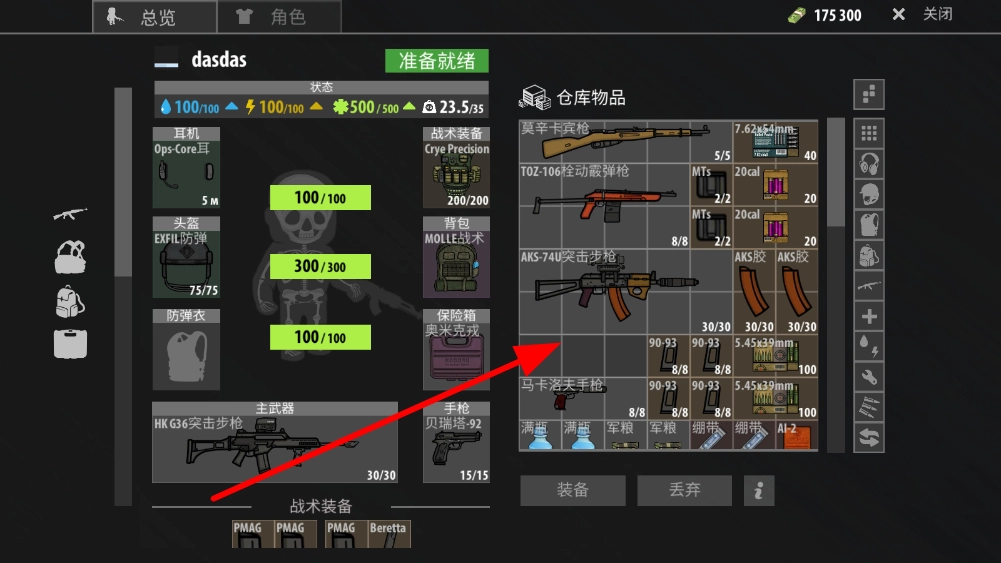 2、进入仓库里面有各类武器可供选择,根据战斗需求,挑选合适的武器装备到自身,提升战斗能力,以便更好地应对冒险中的挑战。