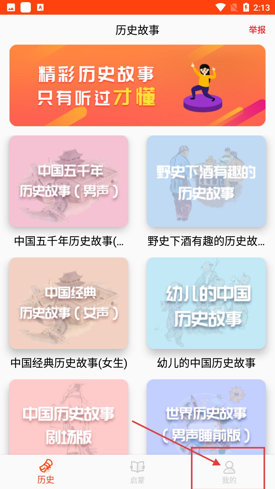 1、打开历史故事应用,在主界面能够浏览到各类历史故事的分类内容,要是需要进入个人中心,点击右下角的【我的】按钮就可以了。