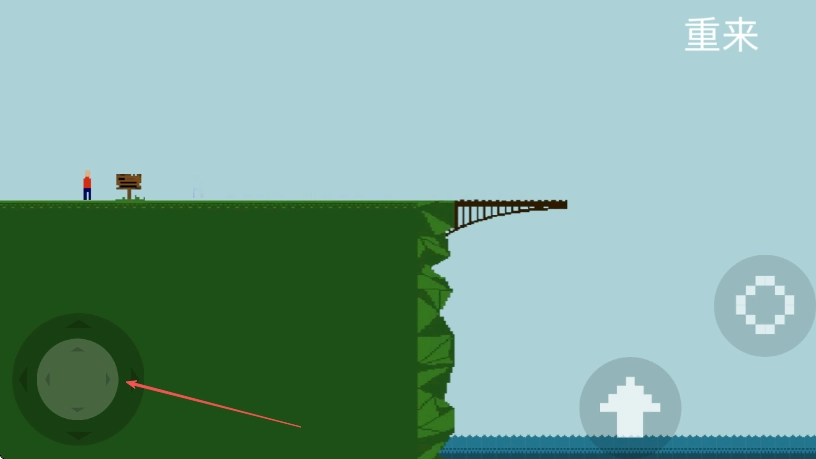 1、启动游戏后,借助左侧的虚拟摇杆来控制角色移动,直至抵达桥的边缘。