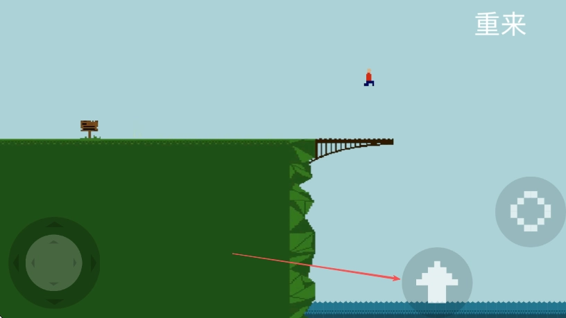 3、点击右侧向上箭头按钮,让人物从桥上跳下。