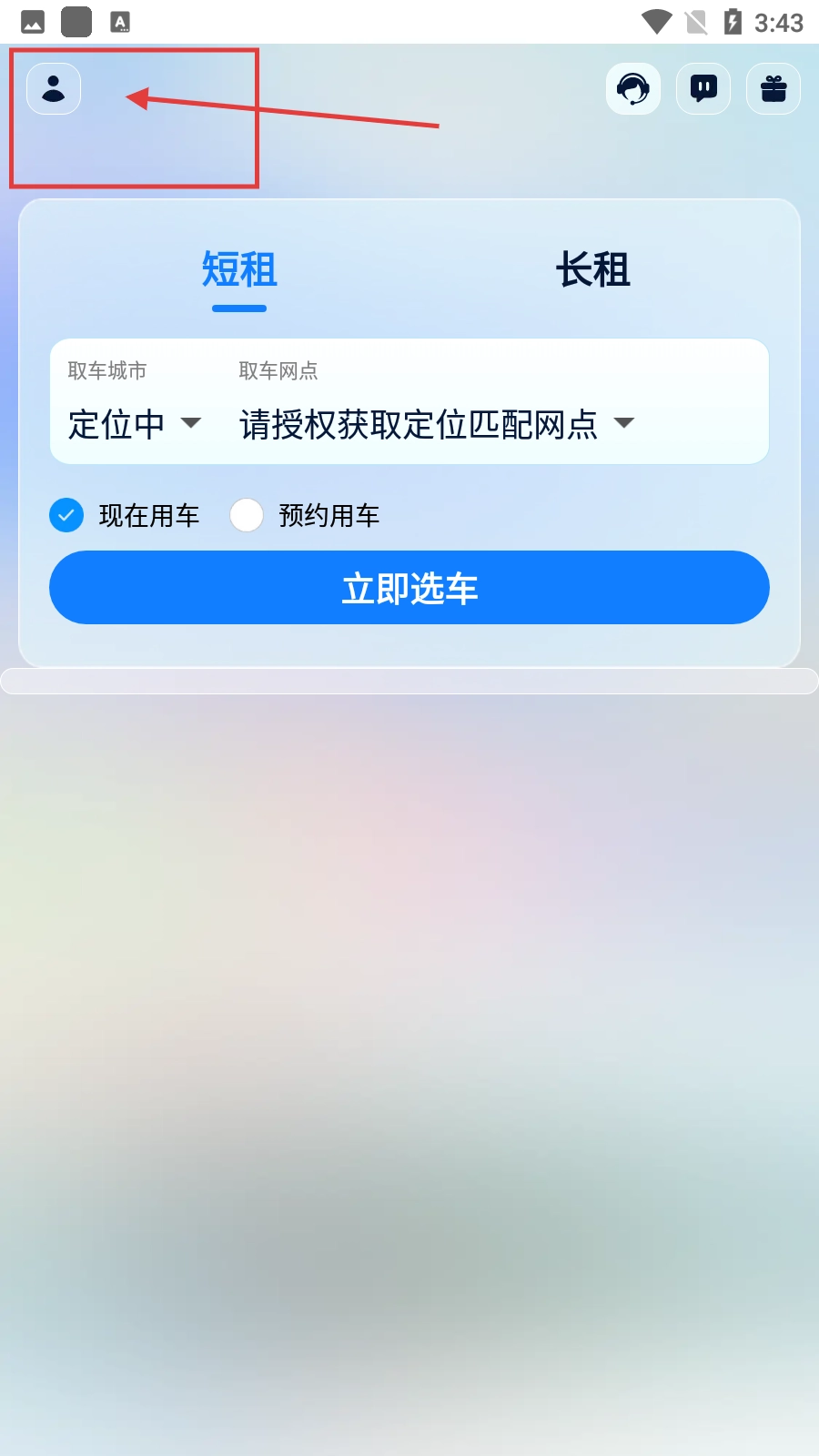 2、进入应用后,在主界面可进行短租或长租车辆的选择操作,若需进入个人中心,点击左上角的个人中心图标即可。