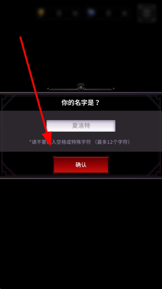 1、先进入游戏,在名字输入界面输入不含空格与特殊字符、字符数不超过12个的名字,输入完毕后点击确认,即可开启地狱之吻的剧情体验。