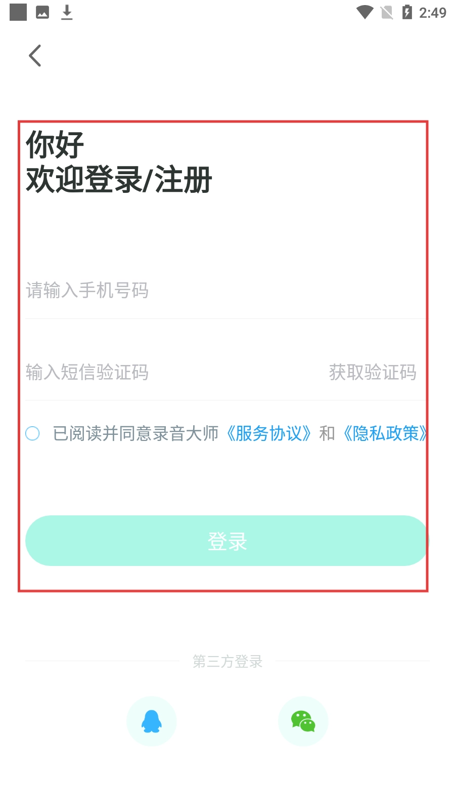 4、在登录/注册界面,输入手机号码、短信验证码,勾选同意协议后点击【登录】按钮,也可第三方方式登录。