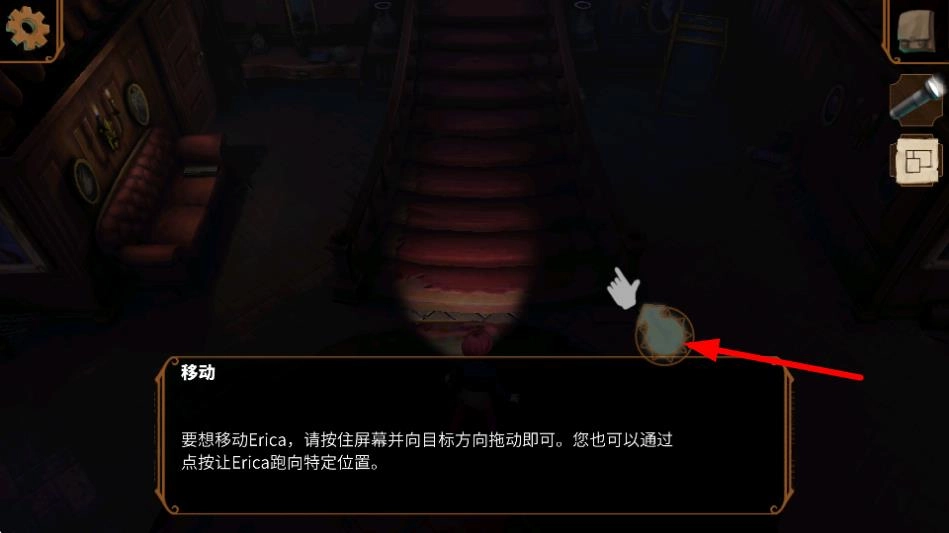 1、在这款解谜冒险游戏里,若要操控角色Erica移动,需按住屏幕并朝着目标方向拖动,这是玩家探索场景、推动剧情发展的基础操作方式。