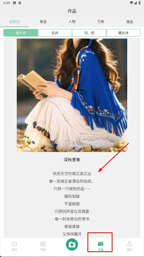 1、点击底部的【写诗】功能按钮,即可进入依图配诗页面。