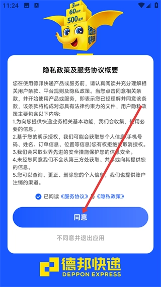 1、打开德邦快递应用,仔细阅读《隐私政策及服务协议概要》,点击【同意】按钮后,即可进入主界面使用各项服务。